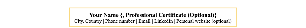 이름은 'First Last Name' 순으로 작성합니다. 산업에서 인정받는 자격증(예: CFA, CPA)이 있다면 'Hannah Joo, CFA'처럼 넣어주세요. 거주지는 현재 거주하고 있는 주소를 간단히 기재합니다. 예를 들면, 한국 거주자의 경우는 'Seoul, Korea', 미국 거주자는 'San Francisco, CA' 처럼 적습니다.